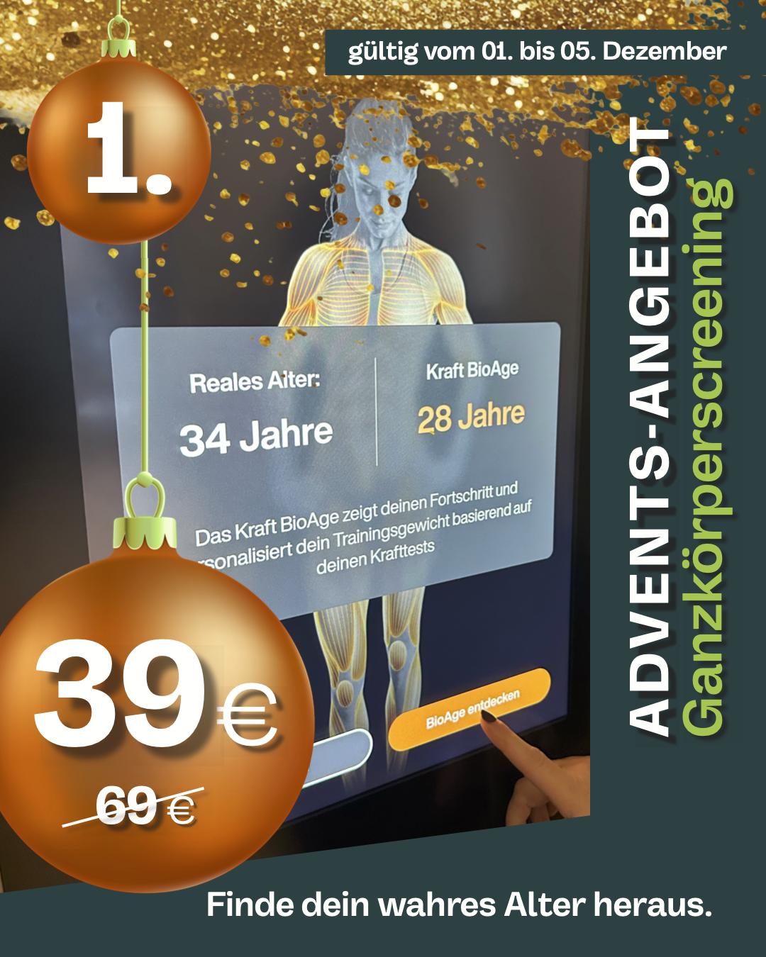 Zum 1. Advent starten wir bei Becker Plus mit einem besonderen Angebot in die Vorweihnachtszeit. Vom 01. bis 05. Dezember bieten wir unser Ganzkörperscreening zum reduzierten Preis von 39 Euro statt 69 Euro an. Dieser umfassende Gesundheitscheck ist ideal für alle, die mehr über ihren Körper, ihre Leistungsfähigkeit und ihren aktuellen Fitnesszustand erfahren möchten.