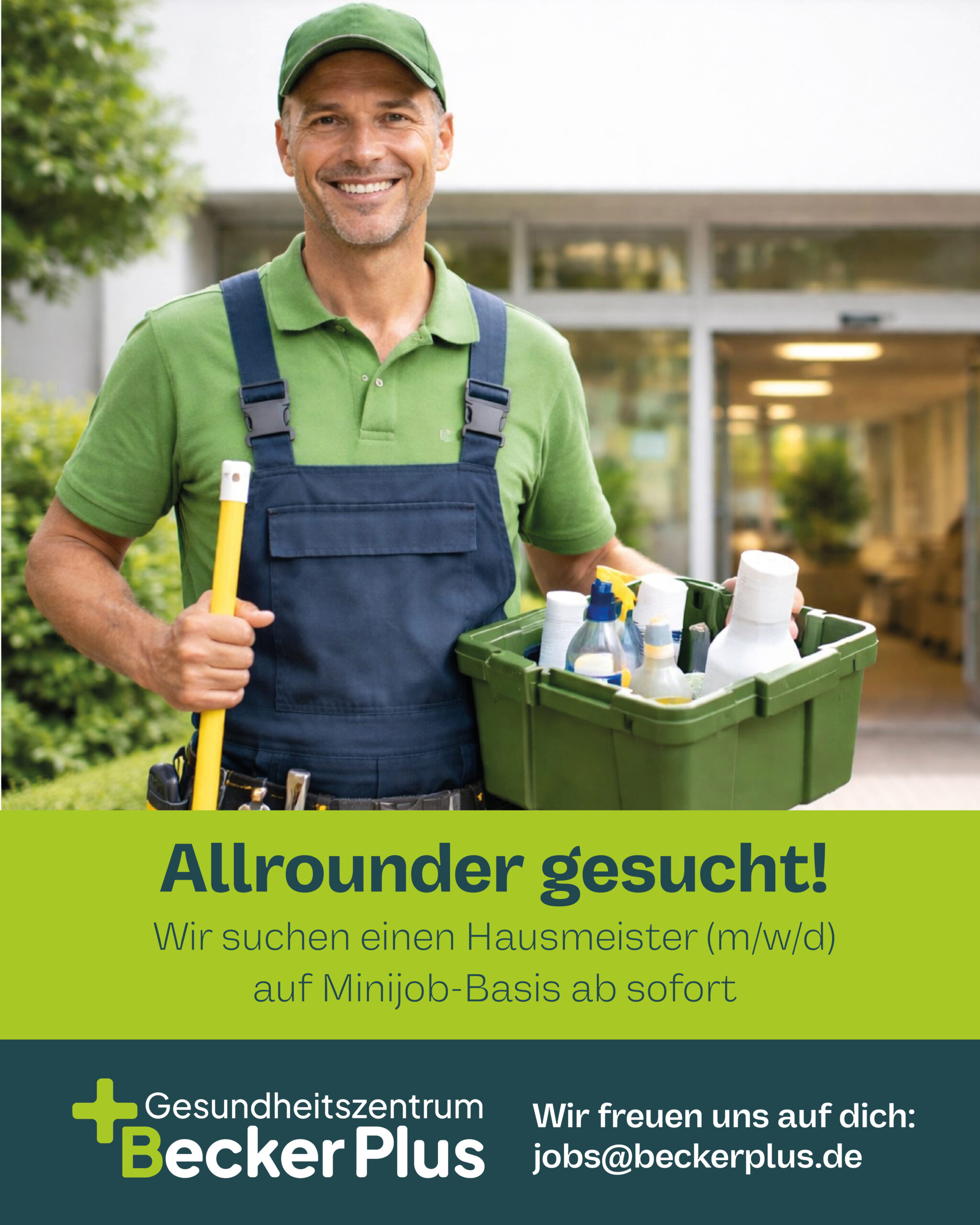 Das Gesundheitszentrum Becker Plus wächst weiter und sucht ab sofort einen engagierten Hausmeister (m/w/d) auf Minijob-Basis, der unser Team zuverlässig unterstützt und dafür sorgt, dass unsere Räumlichkeiten und Außenanlagen jederzeit in einem gepflegten und funktionalen Zustand sind.